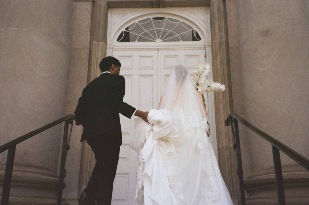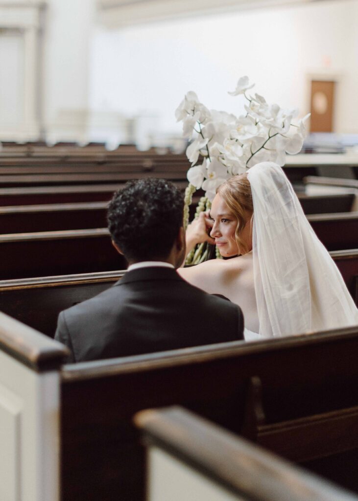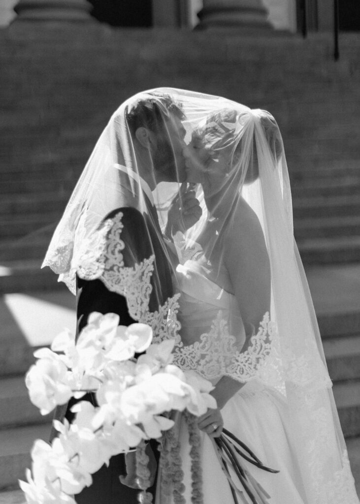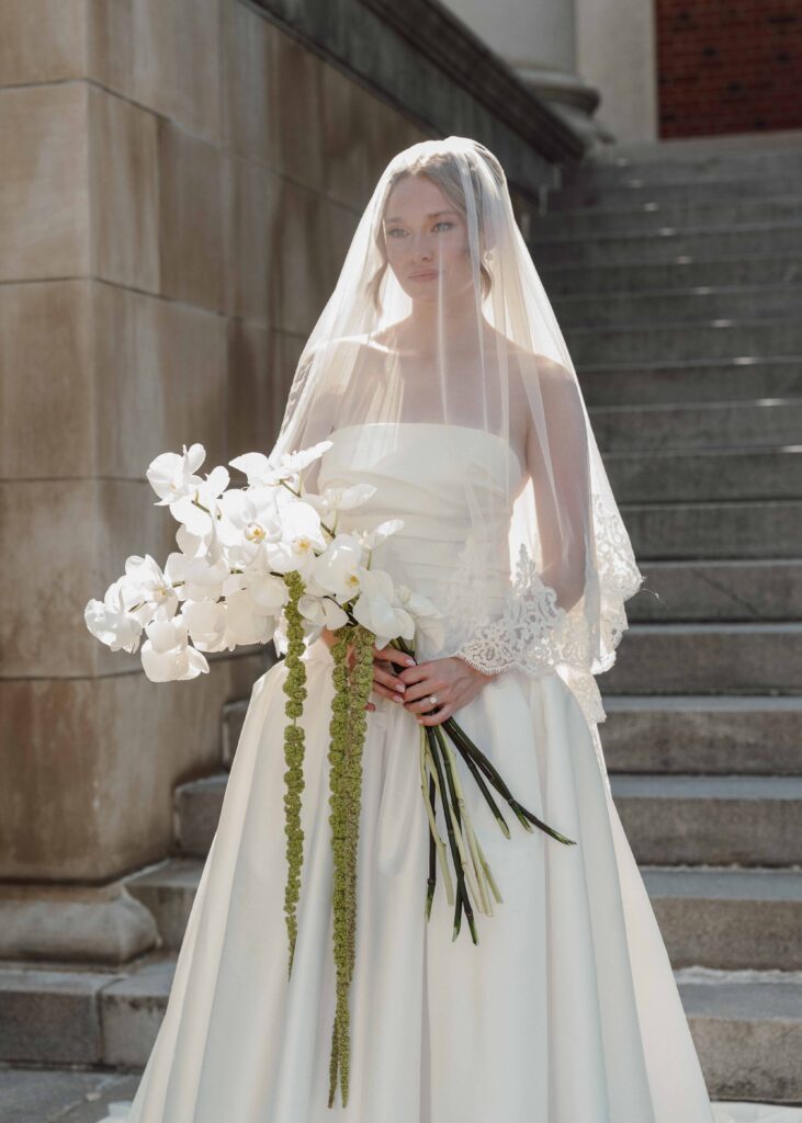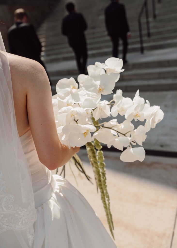 Rylie chose a minimal and elegant wedding look, paired with a modern orchid bouquet, one of my favorites to date, simple, sculptural, and timeless. To complete the look, she wore a cathedral veil that took my breath away (I mean it!).